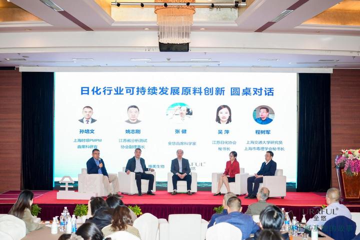 在日化行业可持发展趋势研讨会的圆桌对话环节,全悠首席科学家张健与受邀出席会议的上海时垠PMPM首席科研官CSO孙培文,上海市毒理学会秘书长程树军、江苏省分析测试协会副理事长姚志刚、江苏日化协会秘书长吴萍等嘉宾共同围绕"日化行业可持续发展原料创新"——月桂酰丙氨酸打造中国原创的世界级化妆品原料,展开了一场科技创新与绿色实践的高峰对话。