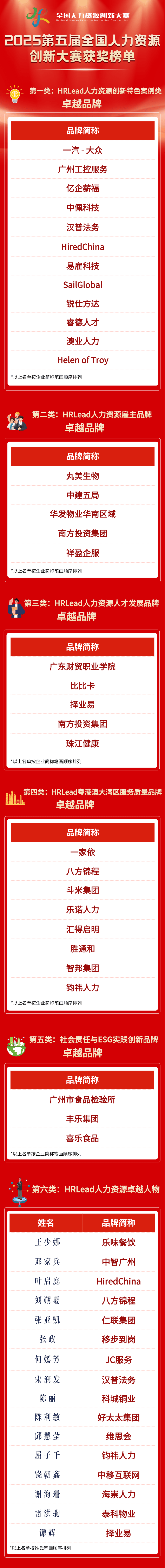本次第五届全国人力资源创新大赛由中国国际商会商业行业商会人力资源管理委员会、HRLead主办,广东省人力资源管理协会等多家单位联合承办,自2025年10月启动以来,得到行业广泛关注与积极响应,累计吸引超500个案例参赛。大赛设置六大专业赛道,经过材料初审、专家评审等多轮严格规范评审,由专业评审团依据统一赛事标准开展全面、公正、严谨评定,最终评选出一批在组织管理、技术创新等领域具有标杆示范意义的优秀主体。其中,名创优品、东鹏饮料、泰科物业、屈臣氏、金沙中国、澳门永利度假村、乐味餐饮、中移互联网、香港宽频、企鹅网络、创智人力、南沙人力、早职到、大禹云薪、移步到岗、宿求有房、蕾茗科技、多力云等多家企业脱颖而出,斩获领军品牌殊荣;同时,大赛还评选出HRLead人力资源创新特色案例类、雇主品牌、人才发展品牌、粤港澳大湾区服务质量品牌、社会责任与ESG实践创新品牌及人力资源领军人物等多个类别的获奖主体。